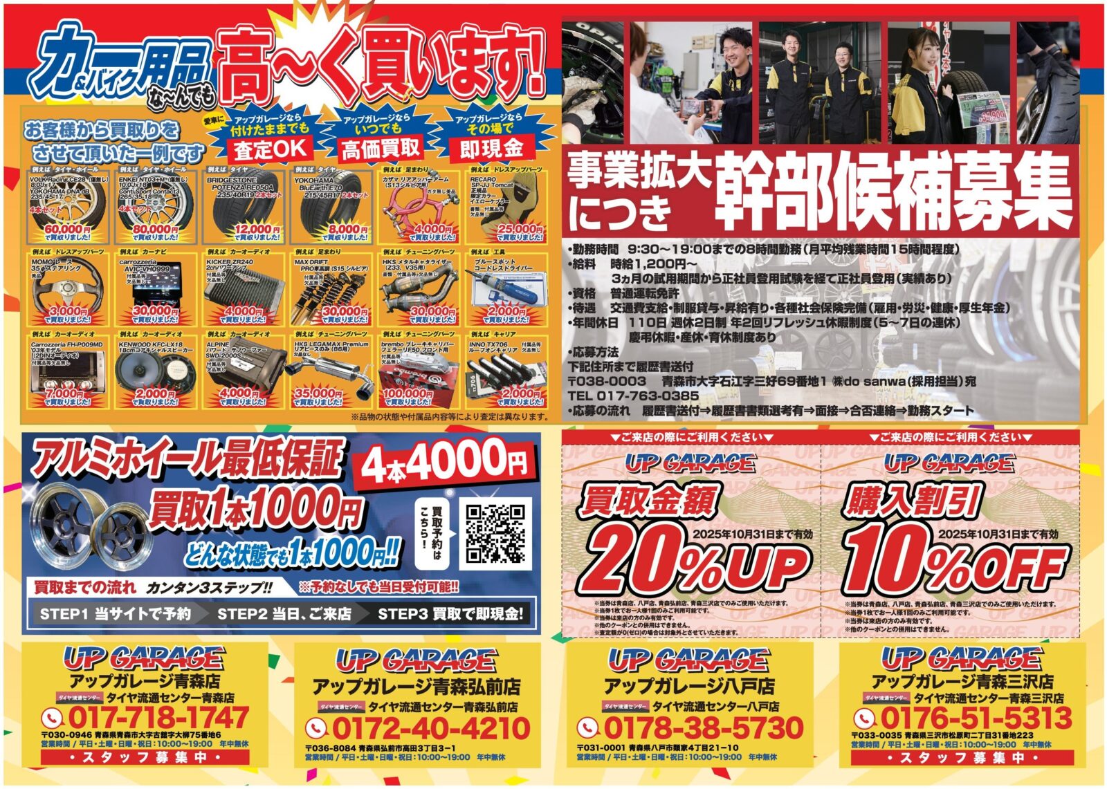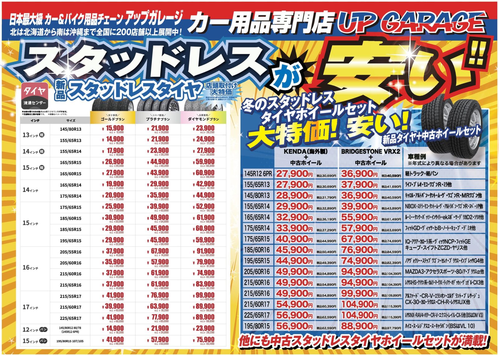 アップガレージ 冬のタイヤ交換応援セール新着情報 2025.10.09新品タイヤから中古タイヤホイールセットまでお買い得な商品満載!!本当に安いです!!今ついているタイヤホイールは現金にて買取させていただきます。タイヤ以外でもカー用品パーツは高価買取中です。アップガレージのご利用ご来店を心よりお待ちしております。セール開催期間:2025年10月10日(金)から2025年11月20日(木)